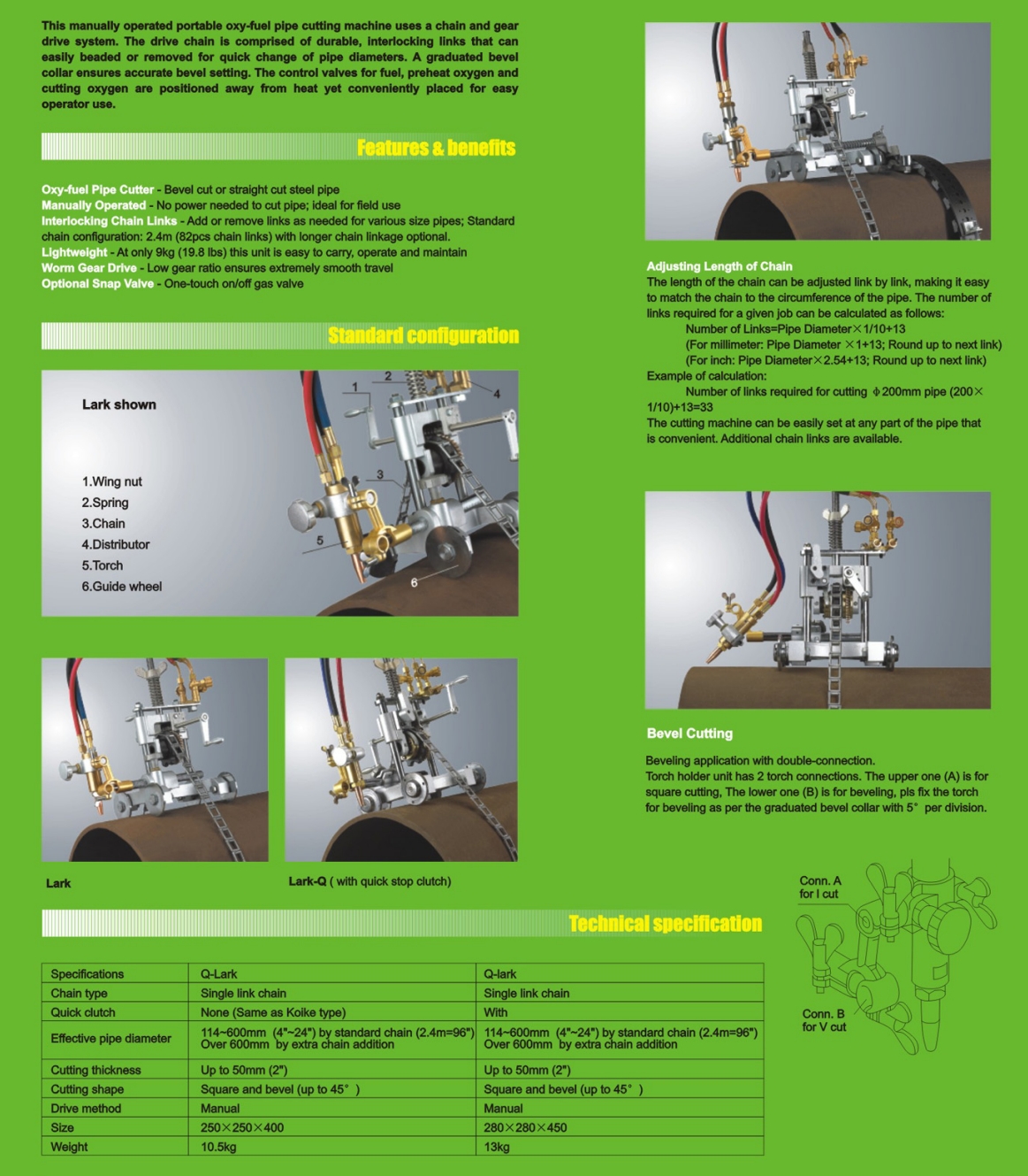 這種手動(dòng)操作的便攜式氧燃料管切割機使用鏈條和齒輪驅動(dòng)系統。驅動(dòng)鏈由耐用的中間鏈條組成,這些鏈條易于串聯(lián)或拆卸,以便快速改變管徑。梯度錐形項圈可確保錐形設定的準確性。用于燃料、預熱氧和切斷氧的控制閥位于遠離熱源的地方,但放置方便,便于操作員使用。